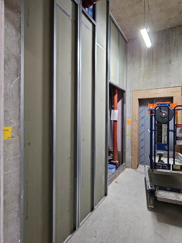 A fire and moisture resistant inner lining of coreboard allows the shaft enclosure to be constructed prior to the building being weather sealed. Shaftwall is used because it is highly durable and is able to withstand the effects of impact and water, to which it would be subjected during a fire, without losing its integrity or fire resistance. This means fire crews maintain protected access to all floors within the buildings